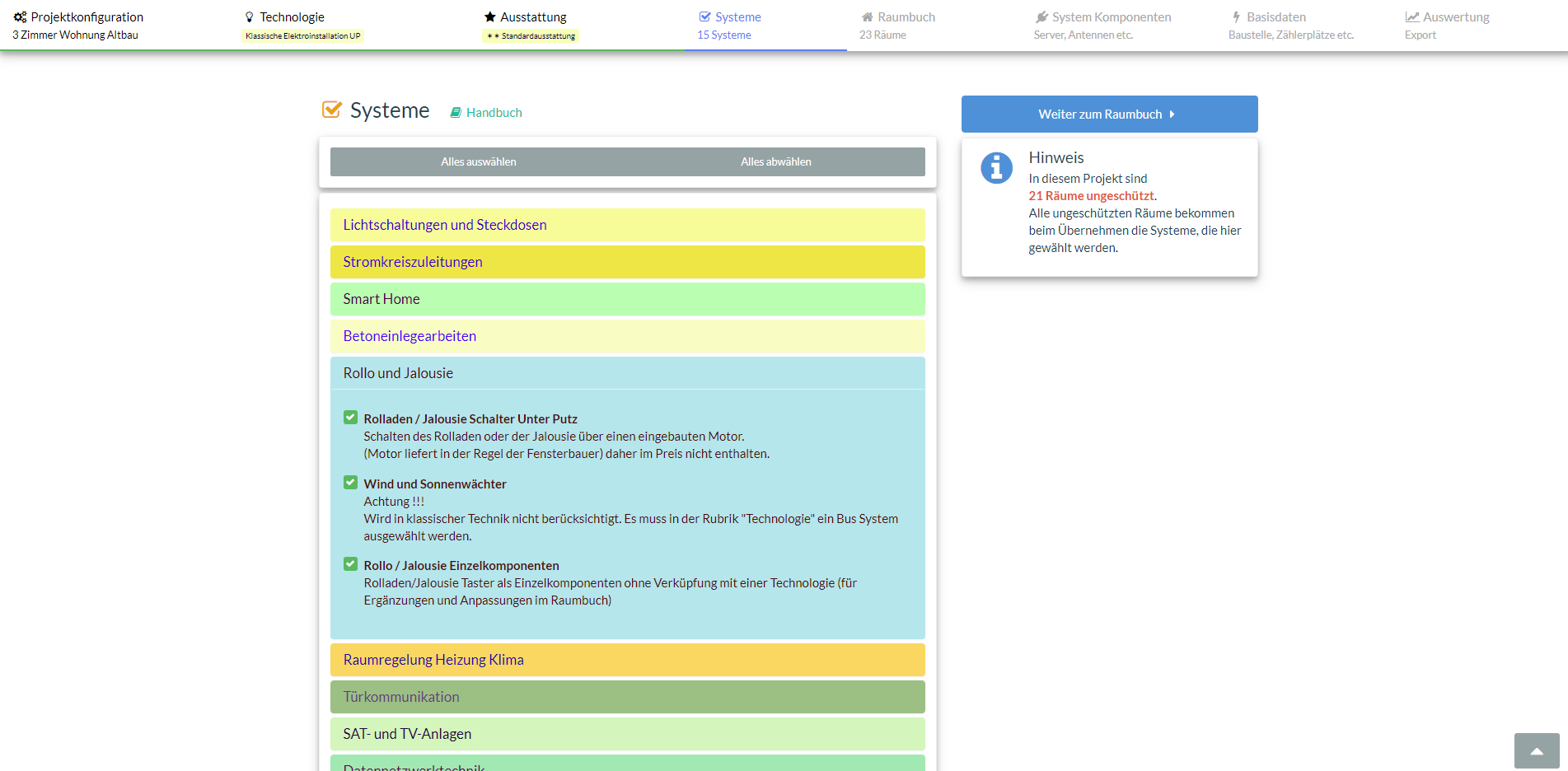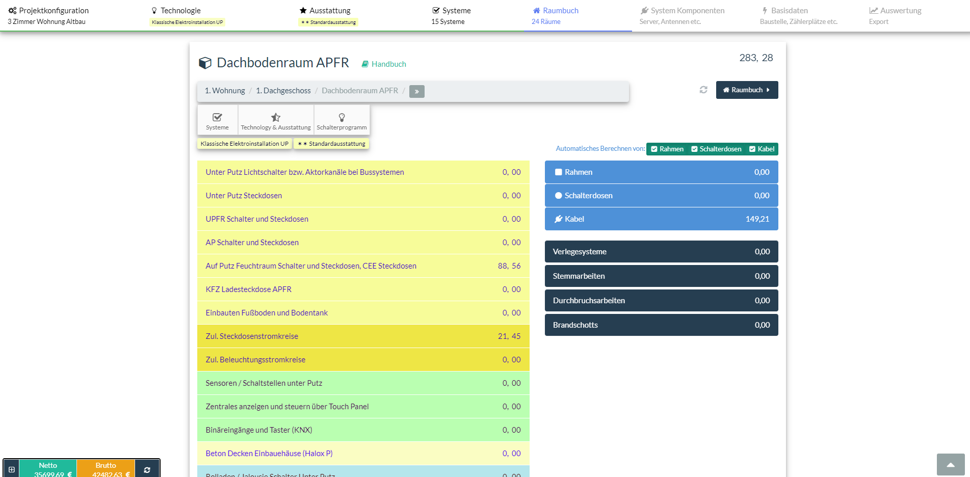 Mit den vorkonfigurierten Räumen ist bereits eine Menge Arbeit getan. Jeder Raum kann nun noch individuell auf weitere Wünsche des Kunden eingestellt werden. Während der detaillierten Bestückung in der Raumspezifikation werden Leistungen für Dosen, Rahmen und Kabelmassen automatisch berechnet.