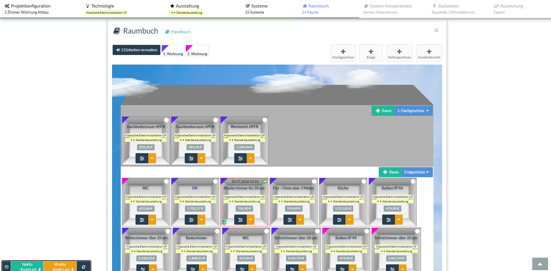 Als nächstes wird das Raumbuch angelegt. Die Etagen, Kellergeschosse und Außenbereiche können durch einfaches Klicken erzeugt werden und genauso einfach jede Etage mit Wohnungen und einer Auswahl aus über 100 bereits vorkonfigurierten Räumen bestückt werden. Die angelegten Räume zeigen sofort die raumbezogenen Kosten an.
