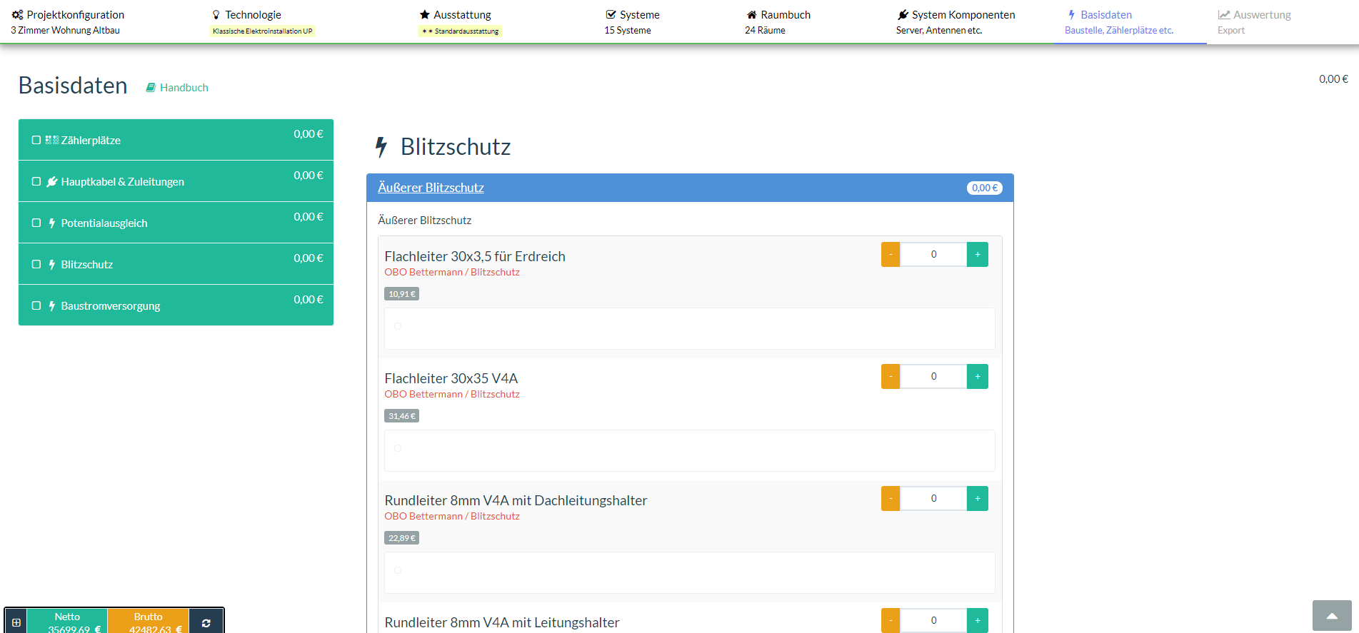Die Eingaben von Basisleistungen wie Zählerplatz, Unterverteilungen, Potenzialausgleiche oder auch Baustromversorgung werden grafisch unterstützt.