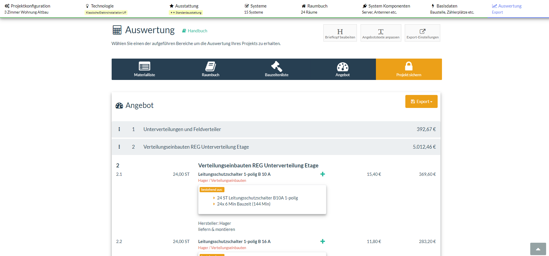 Auf der Auswertungsseite kommt alles zusammen und wird strukturiert dargestellt. Hier finden Sie Ihre Angebotszusammenfassung, die sich einfach per Knopfdruck als PDF oder im GAEB-Format exportieren lässt. Außerdem werden in diesem Bereich Material- und Bauzeitenlisten ausgeworfen.